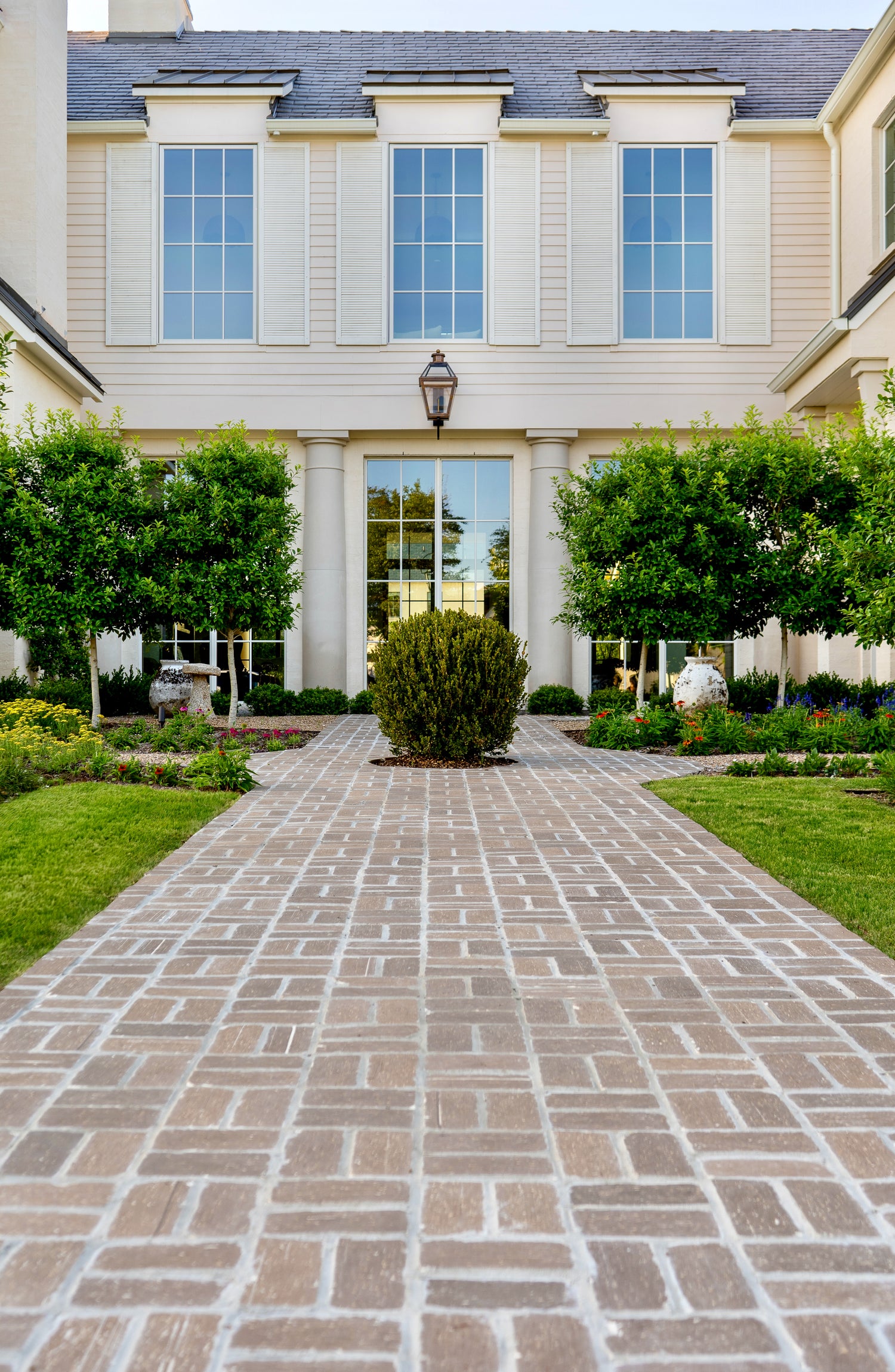 An inviting front entrance features an antique brick pathway leading to a perfectly shaped boxwood globe at its center. Patio holly trees frame the walkway, while salvia and yarrow florals add soft pops of color, creating a timeless and welcoming approach to the home.