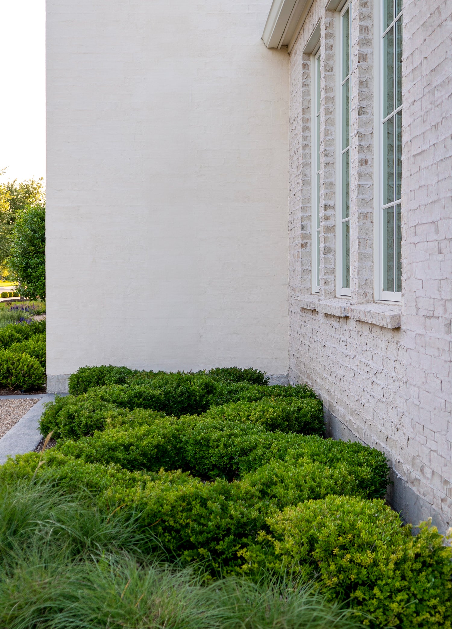 A rhythm of texture and form—dwarf yaupon hollies laid out in a structured pattern, softened by wisps of ornamental summer grasses. Timeless, tailored, and made for the Texas sun.