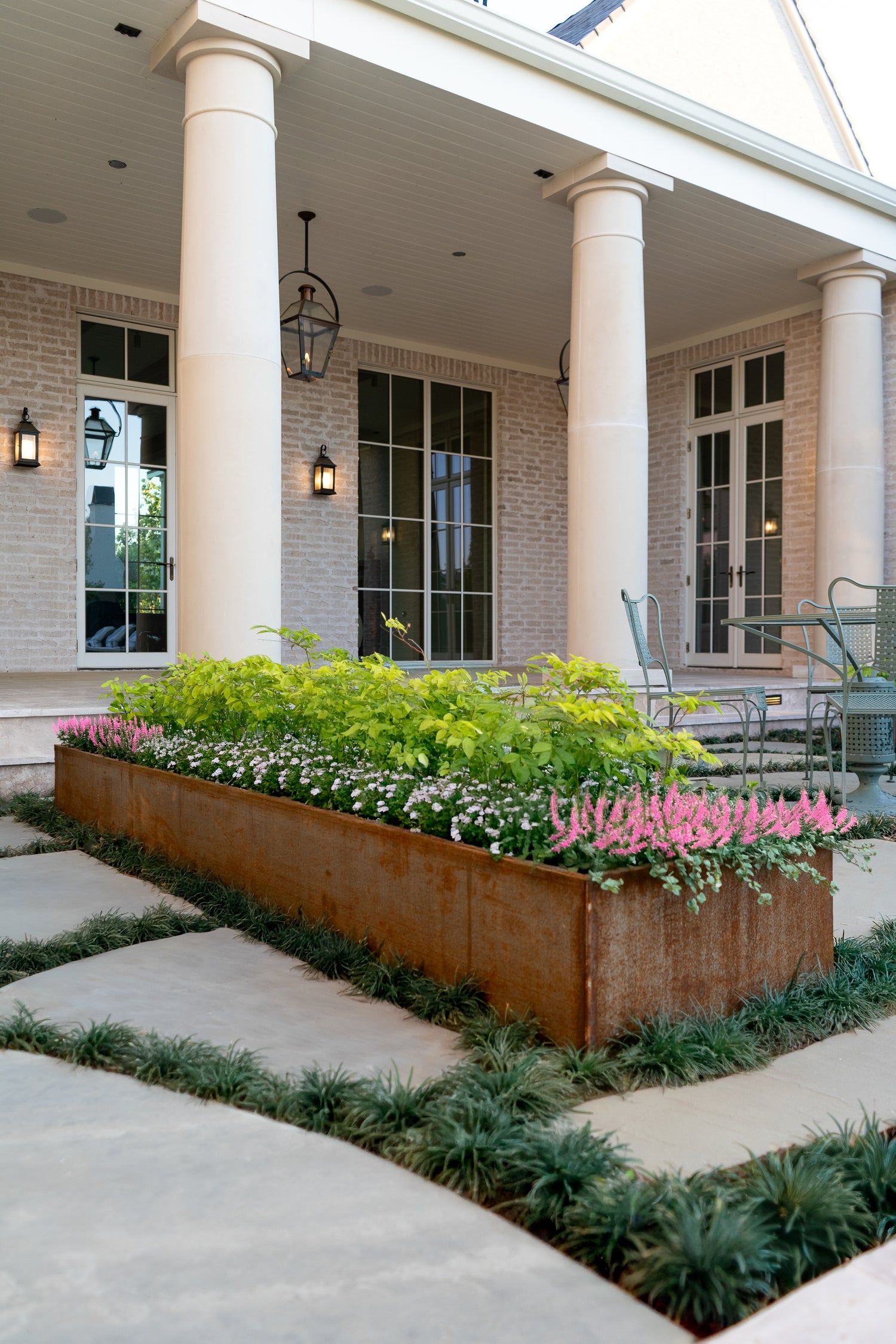 We incorporated our custom welded Geo Steel Planters into the backyard courtyard, paired with weekly maintenance and seasonal plantings to keep them vibrant year-round. For this installation, a rustic steel Geo Planter was planted with Whitewater Veronica and Indigofera florals, bringing rich color and texture that enhances the elegance of the home’s outdoor living space.