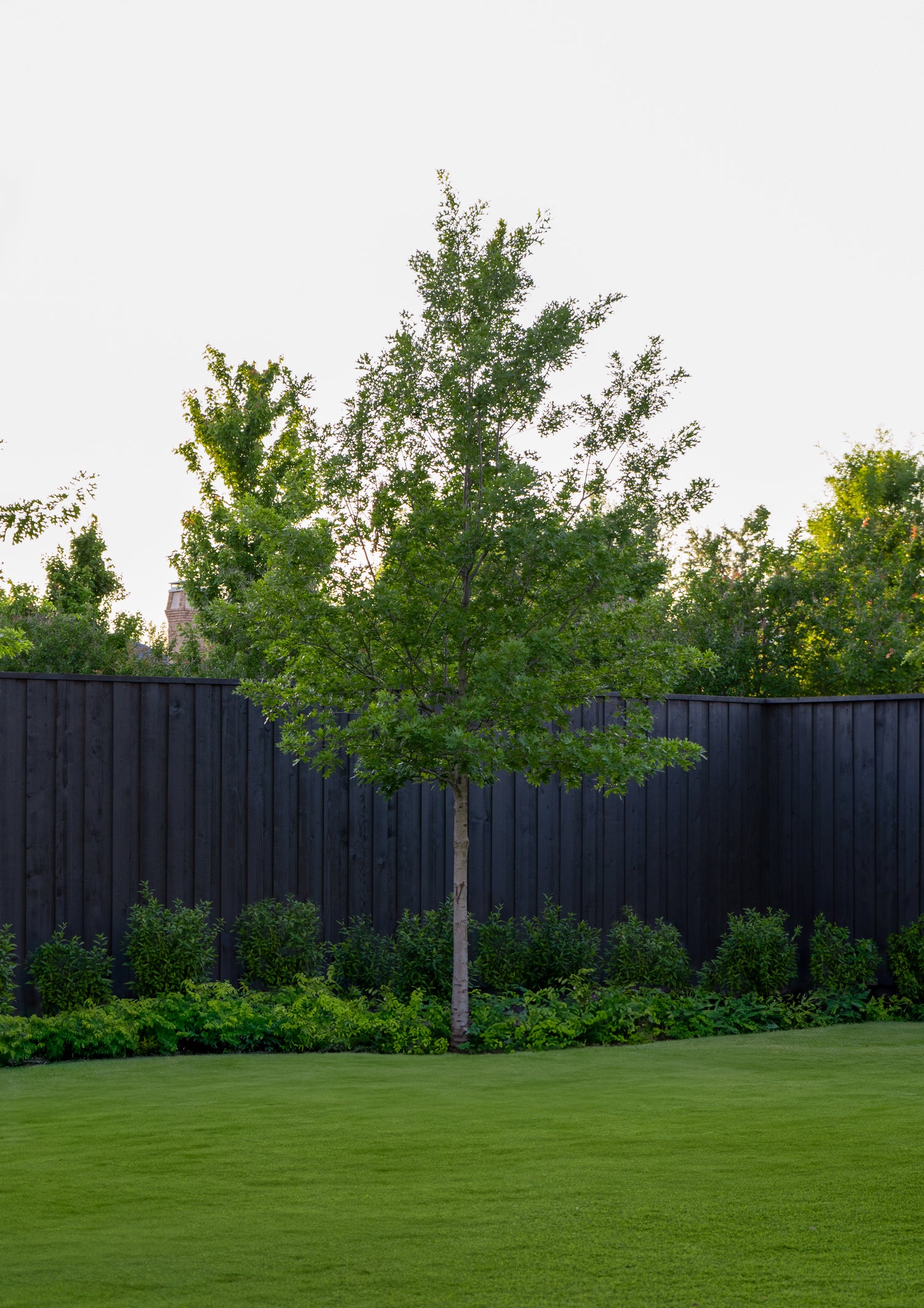 A bedding design featuring a mature red oak tree, lush green almond shrubs along the back, and Indigofera florals planted throughout the front, adding softness and layered texture.